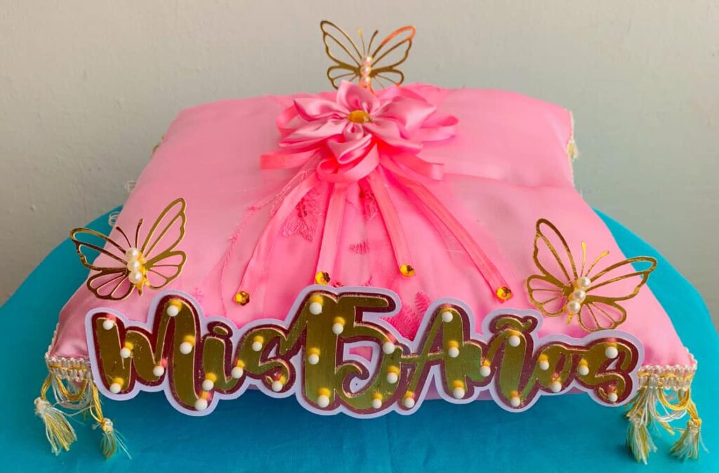 El uso de tela satinada le confiere al cojín un aspecto elegante y lujoso, perfecto para una celebración tan importante como los quince años.