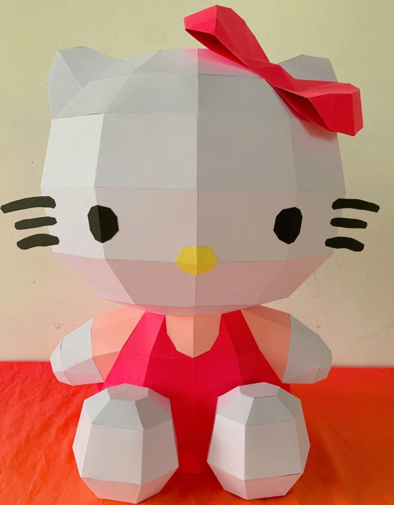 - Preparación de Plantillas: Descarga o crea plantillas de figuras de Hello Kitty en estilo lowpoly. Imprime estas plantillas en papel y recórtalas cuidadosamente.