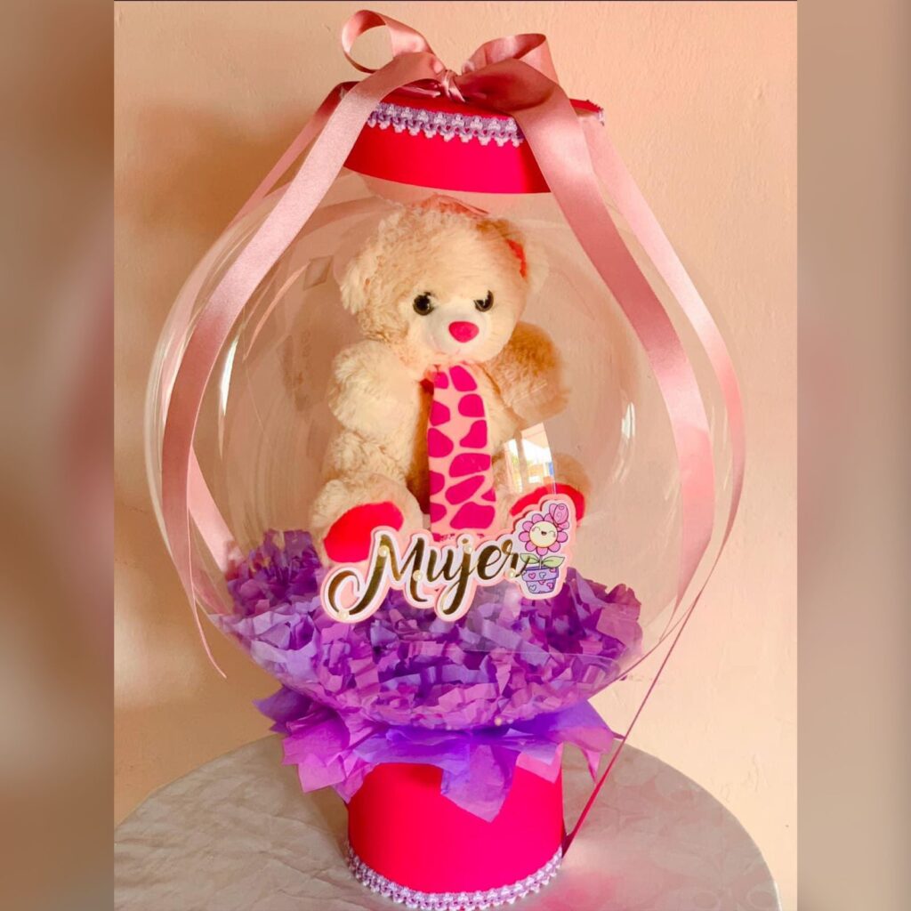 Un globo burbuja es una esfera transparente de plástico resistente que permite ver el contenido en su interior de forma clara. Agregar un peluche dentro de este globo crea un efecto adorable y sorprendente. Puedes personalizar el peluche según la ocasión, ya sea un osito para un cumpleaños, un conejito para un baby shower, o cualquier otro peluche que se adapte al evento.
