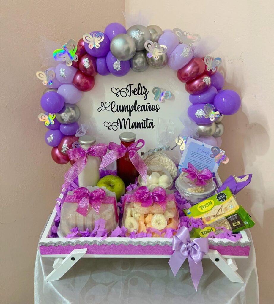 La ancheta que vamos a crear estará compuesta por un espaldar redondo que sostiene globos R5 decorativos. En su interior, incluirá una selección de alimentos saludables como sándwiches de jamón de cerdo y queso, fruta picada, yogur natural, avena casera, huevos de codorniz, parfait de yogur griego con granola, galletas multicereal Tosh y manzanas verdes. Todo esto se personalizará con detalles decorativos que harán que la ancheta sea visualmente atractiva y festiva.